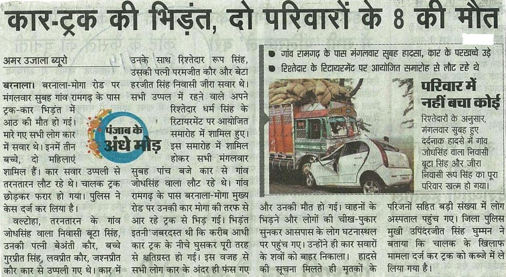- 8 persons from two families belonging to village Jodhsingh wala of Tarantaran, Punjab (India) were died in a road accident near village Ramgarh on Barnala Moga road on a day during 2014.