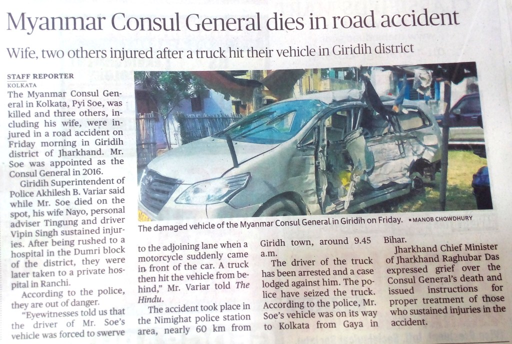 The Myanmar Counsel General in Kolkata died in the morning hours in a district in Jharkhand (India). He died on the spot while the other three occupants including his wife, his driver and his personal adviser were got injured in the incident. The driver of the official was forced to swerve to an adjoining lane when a 2 wheeler came in front of the car, all of a sudden. The car was then hit by a truck, from behind. The state chief minister expressed grief over his death.