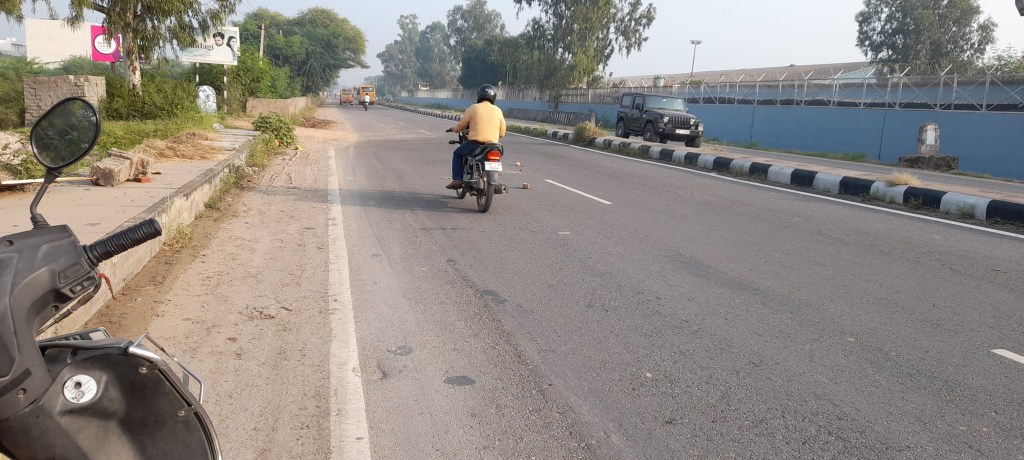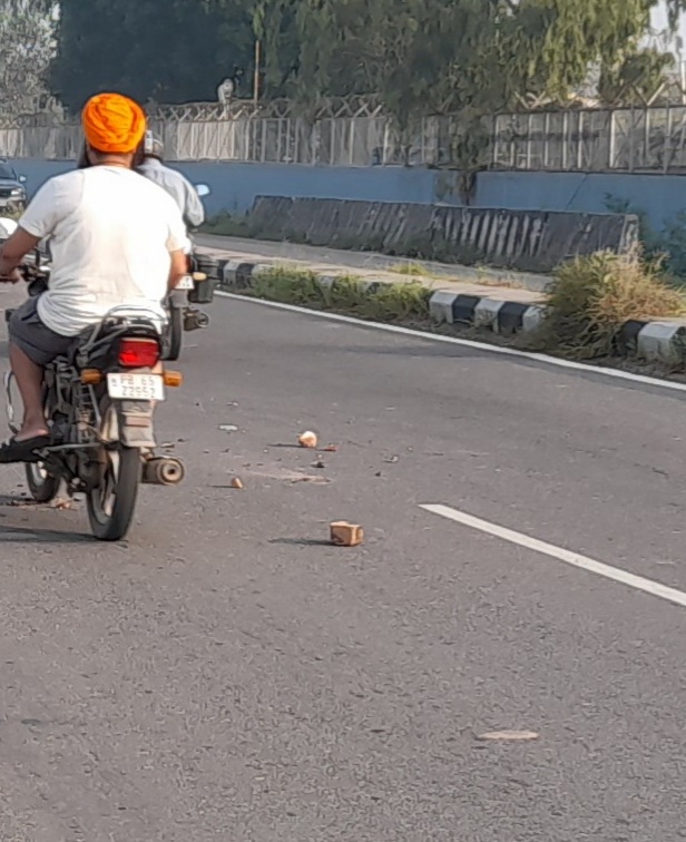 In an incident at about 7:45 AM couple of days ago, I saw a person getting unbalanced while he was driving 2 wheeler on Banur – Kharar road in Mohali (Punjab). On trying to know, why it has happened, I found few brick bats/ stones lying on road.