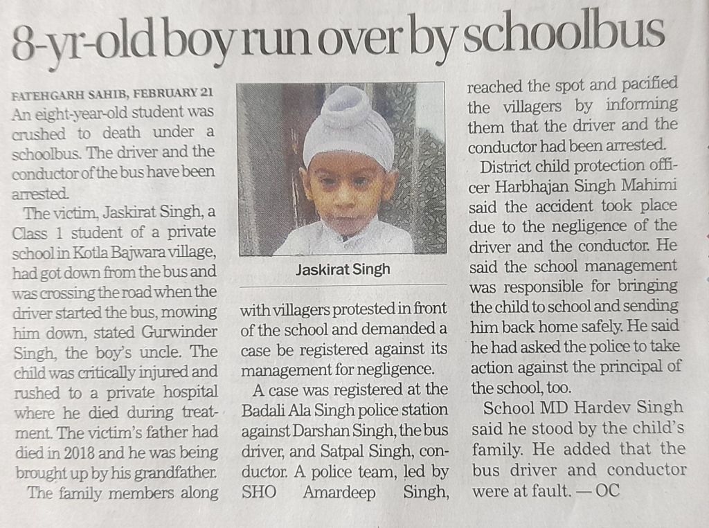 An eight-year-old student was crushed to death under a school bus, couple of days ago. The victim, a Class 1 student of a private school in a village of Fatehgarh Sahib District of Punjab, had got down from the bus and was crossing the road when the driver started the bus, mowing him down. The child was critically injured and rushed to a private hospital where he died during treatment. It is heart-wrenching to know that the victim’s father had died in 2018 and he was being brought up by his grandfather. The driver and the conductor of the bus were arrested by police.